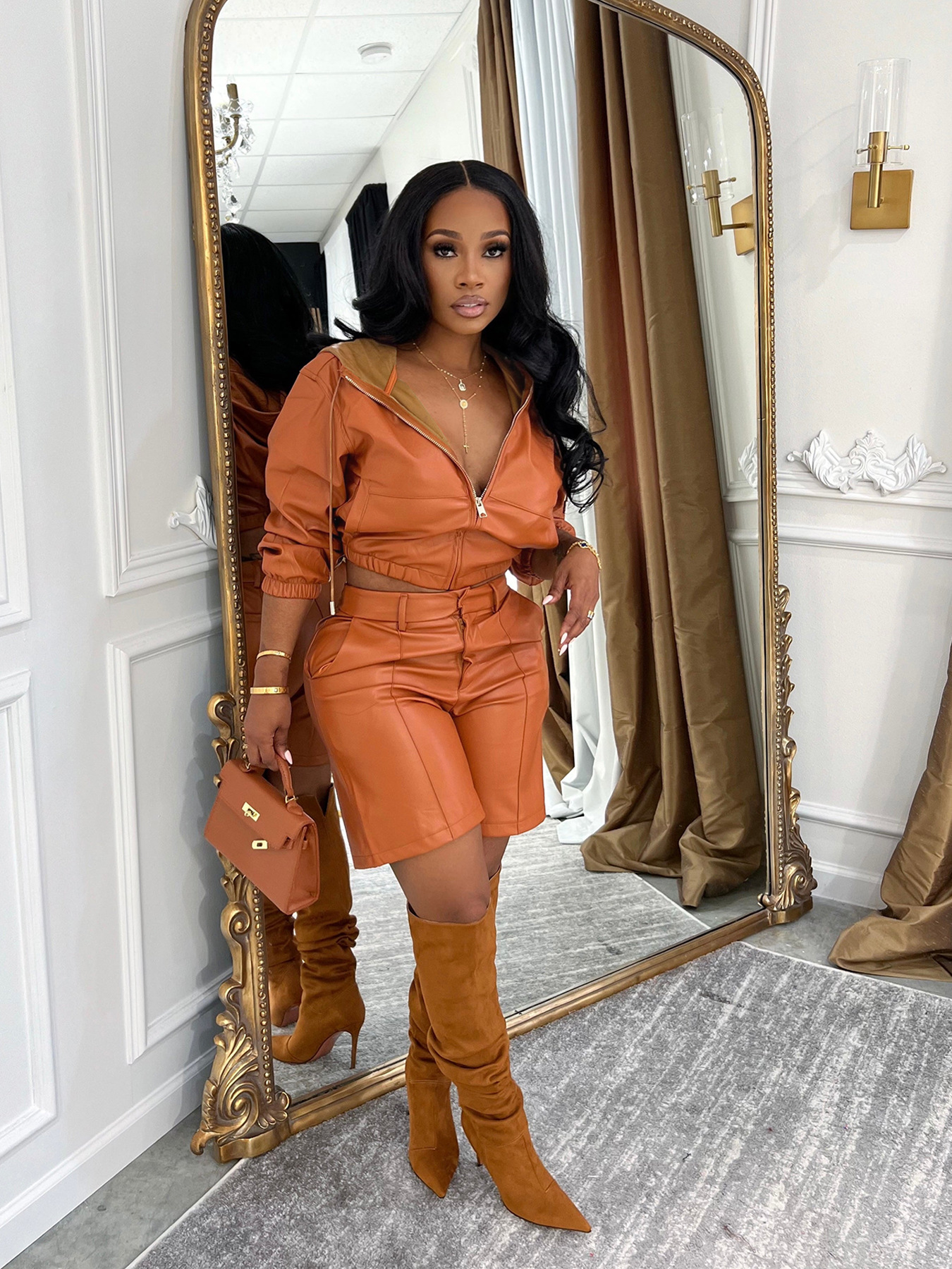 Copy| Product Name | Leather jacket with hat, long sleeved five quarter pants, shorts set |