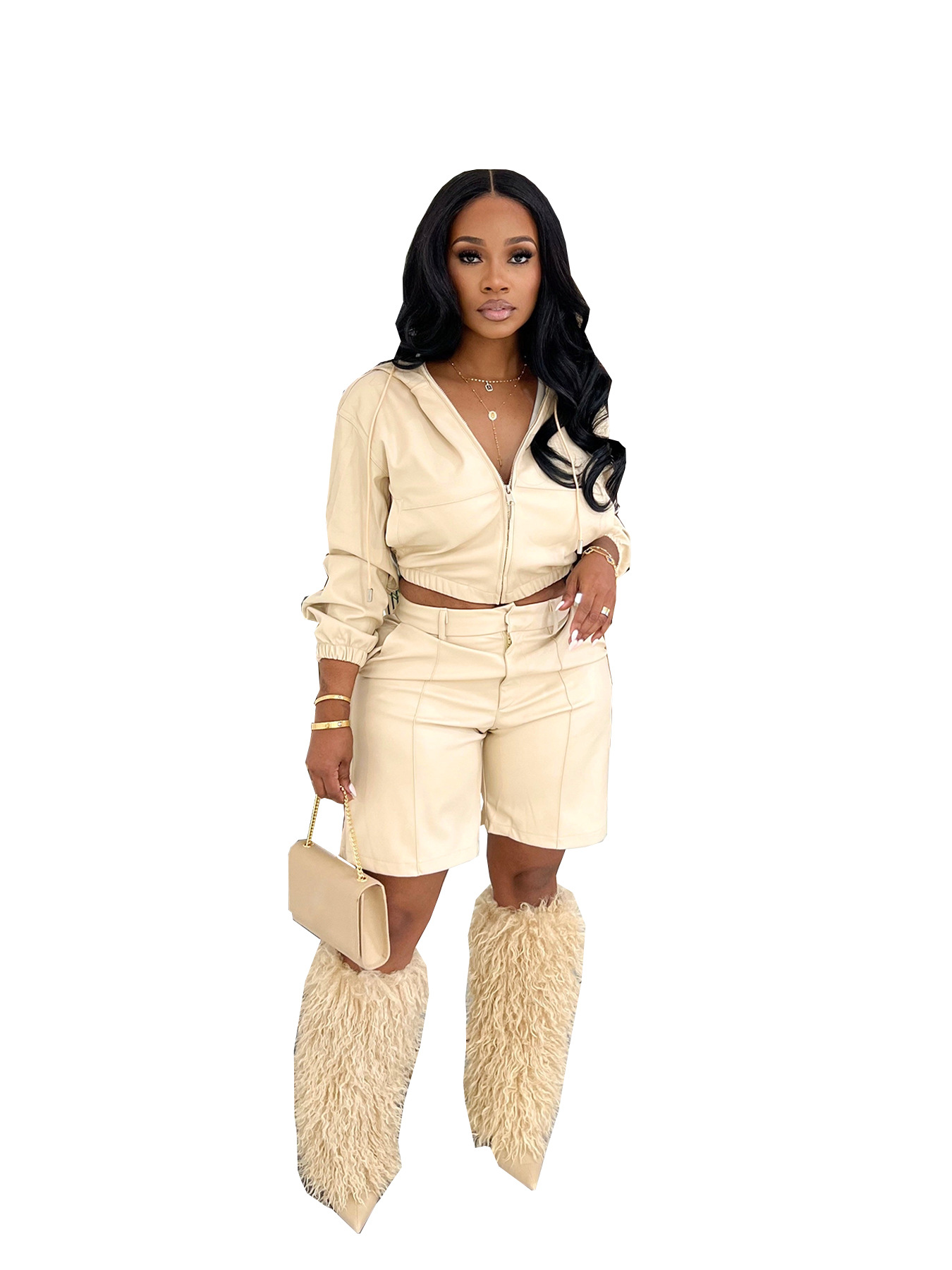 Home>Two Pieces Set>Two Piece Pants Set>Leather jacket with hat, long sleeved five quarter pants, shorts set