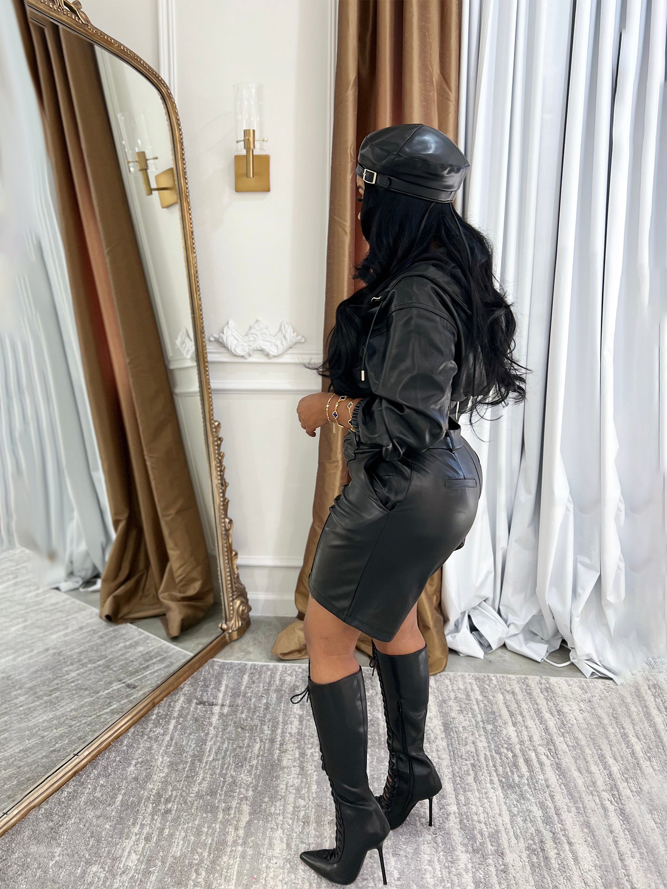 Leather jacket with hat, long sleeved five quarter pants, shorts set