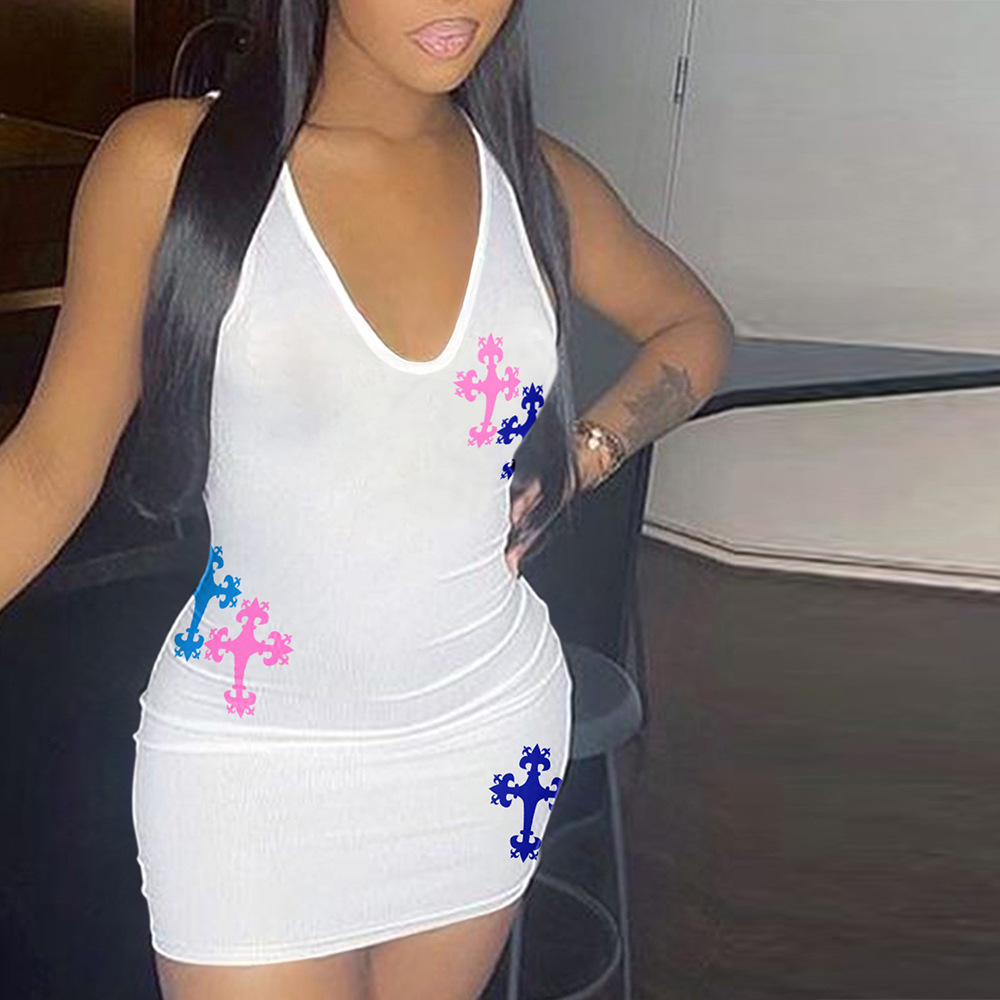 Printed Cross V-Neck Sexy Pack Hip Dress